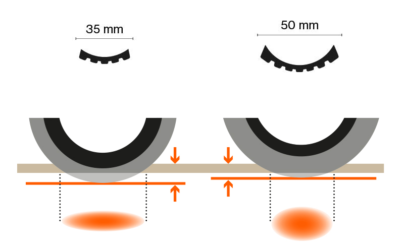 L’impronta a terra del copertone influisce sulla resistenza al rotolamento: i copertoni più stretti si deformano maggiormente, mentre quelli più larghi si appiattiscono meno, riducendo la resistenza e consentendo una velocità più elevata con meno sforzo.